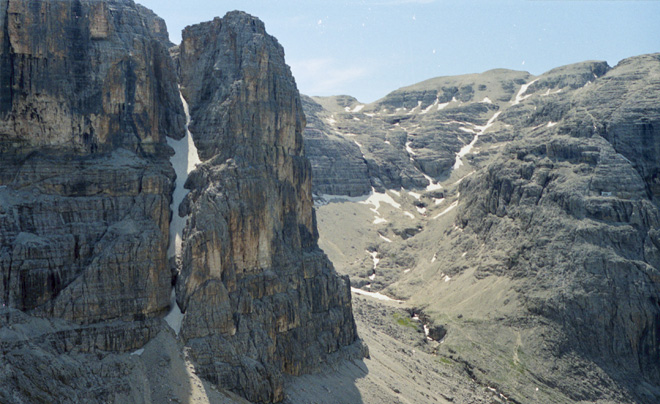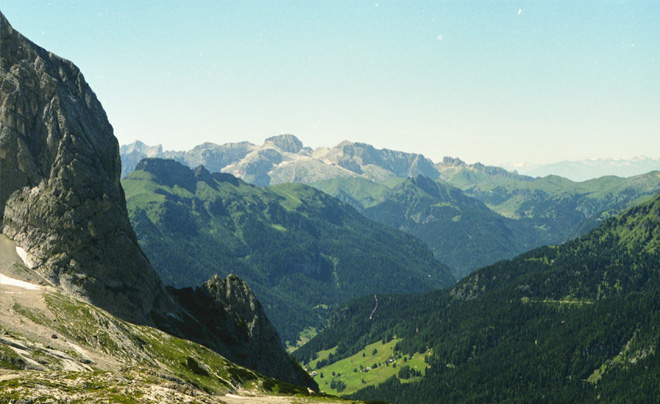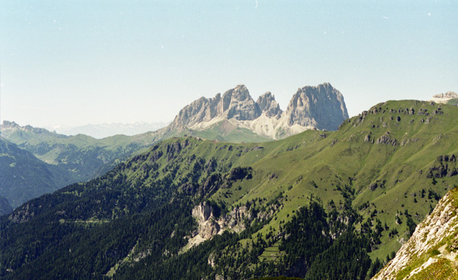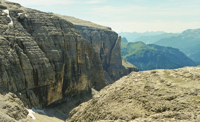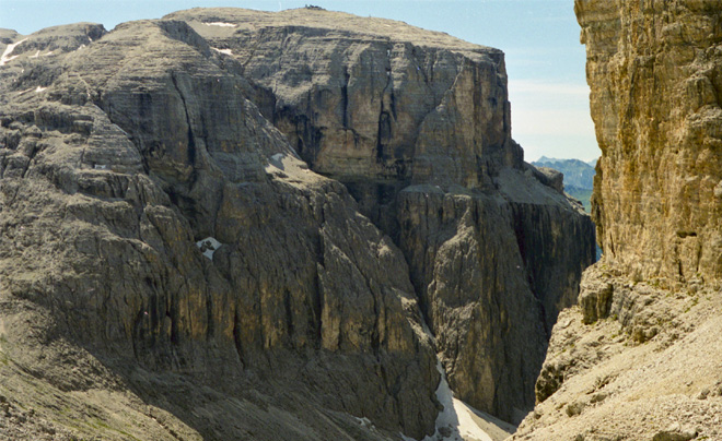 La Val Lasties è uno dei luoghi più suggestivi e spettacolari del gruppo del Sella: si tratta di un profondo intaglio che si spinge fin nel cuore del massiccio dividendolo in due parti, il Pordoi a sud e il sella propriamente detto, con l'altopiano delle Mesules, a nord. Camminare in questo ambiente sontuoso, circondati da pareti verticali che svettano centinaia di metri sopra le nostre teste, è qualcosa di spettacolare che difficilmente si può ritrovare in altro luoghi. L'itinerario ha inizio presso il Rifugio Monti Pallidi, lungo la strada che conduce al Passo Sella, dove parte il sentiero n°647 che procede inizialmente nel bosco parallelamente alla strada; dopo qualche decina di metri la traccia piega verso destra e inizia a risalire dapprima con un fondo coperto di radici, poi via via sempre più roccioso fino ad arrivare a un breve tratto in cui per superare degli alti massi è necessario usare le mani. Superata quota 2000 metri ci si sposta verso nord, sfiorando la parete verticale del Sass Pordoi, da cui parte la Via Maria che conduce alla cima. Il sentiero si fa più stretto e attraversa in diagonale un pendio in direzione nord, fino a raggiungere la base del ghiaione della Val Lasties, che si risale con ripidi tornanti. Dopo circa 15 minuti la pendenza si fa più dolce e la vallata si apre tra le imponenti pareti verticali del Sass Pordoi a destra e del Sella a sinistra; si prosegue lungo la traccia che attraversa piccole chiazze erbose costellate di stelle alpine, mentre alla vostra destra compare all'improvviso la cima del Piz Boè. Il percorso si fa più pianeggiante dando la possibilità di riprendere un po' il fiato fino a raggiungere la base della parete rocciosa di fondovalle; qui un breve tratto di roccette permette di guadagnare quota rapidamente fino a superare i 2600 metri. Il sentiero prosegue poi per un breve tratto su un ghiaione spostandosi leggermente verso sud fino alla base di una nuova parete rocciosa, che si risale tra le roccette e con ripidi tornanti. Terminato questo tratto si raggiunge un immenso pianoro roccioso e il panorama si apre verso nord sul fantastico altopiano delle Mesules; attraversato in diagonale l'anfiteatro un nuovo breve tratto tra le rocce porta ai 2839 metri, della Forcella Antersass da cui si apre panorama spettacolare sulla Torre Berger, pinnacolo roccioso posto all'ingresso della Val de Mezdì.