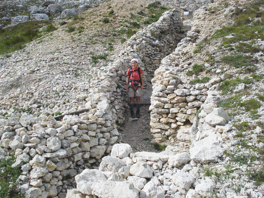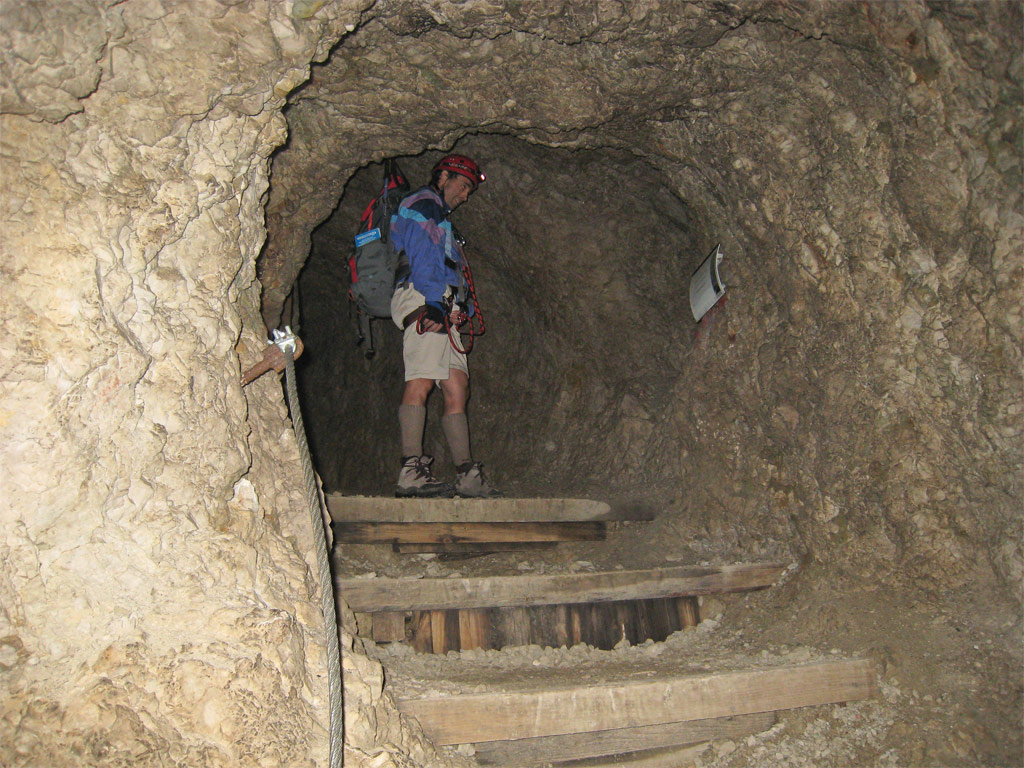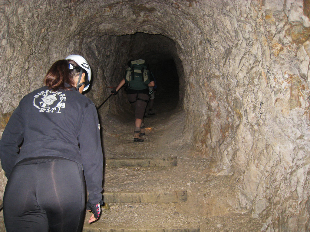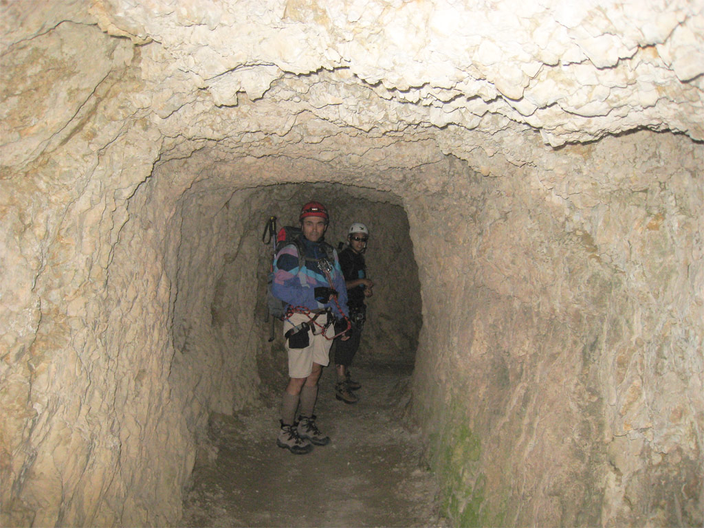 inizialmente la cengia che con percorso spettacolare, tra resti di postazioni e passaggi in galleria, ci porterà fino alla