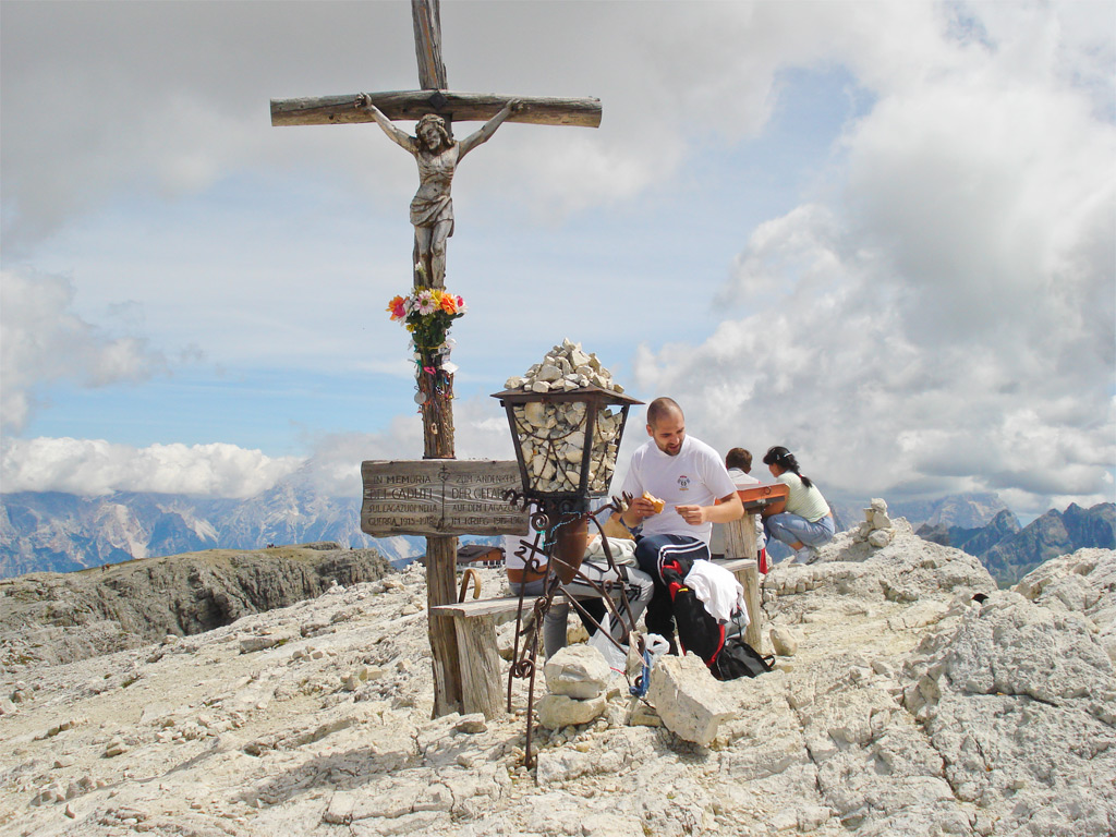 Raggiunto il rifugio si procede in direzione Ovest fino alla cima dove una croce in legno ricorda i caduti della Prima Guerra
